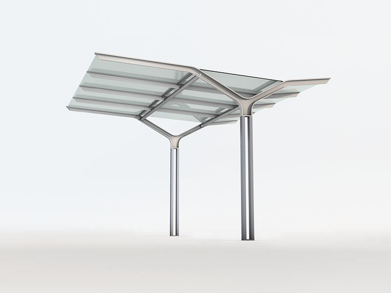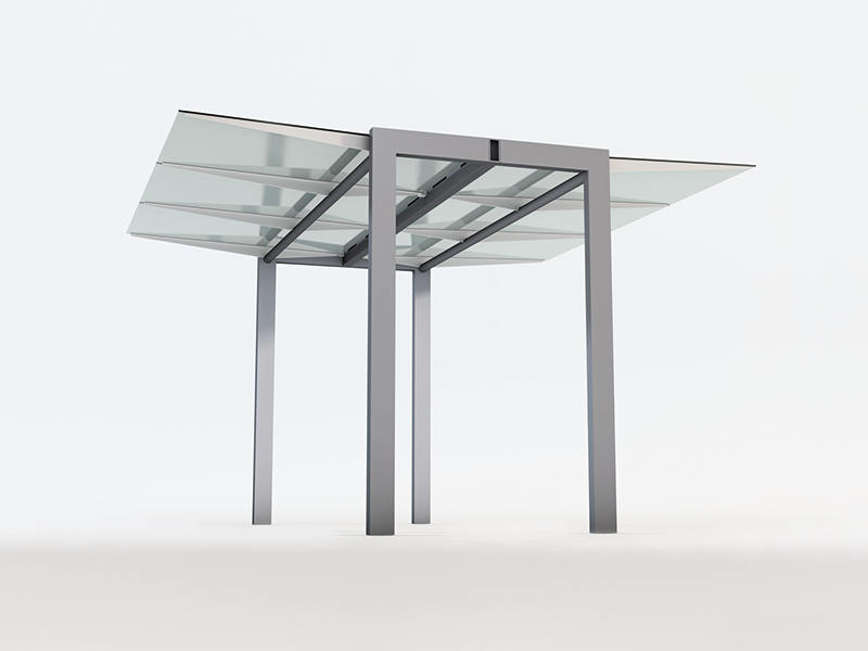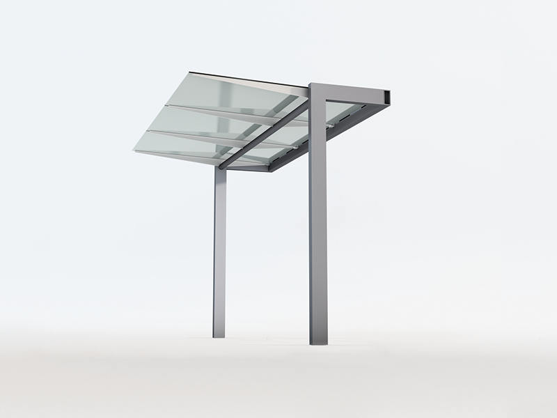 This shelter is made of steel and glass with simple profiles and is easy to produce. Through the characteristic design with the angled supports and the use of simple basic shapes, the product takes on a symbolic, memorable look. It can be erected on its own, in pairs, or in larger groups.